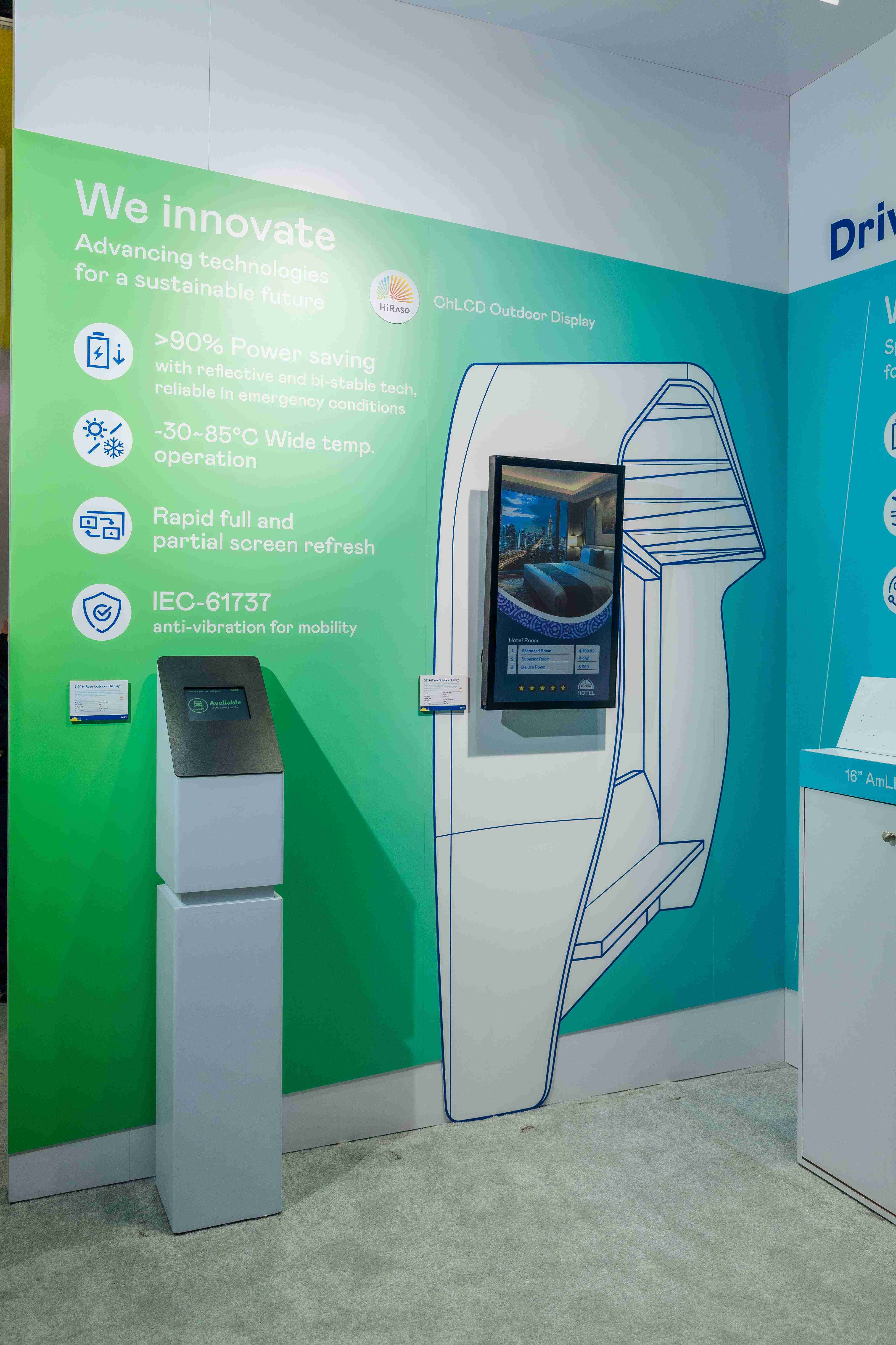 HiRaso胆固醇液晶显示器运用反射环境光线的方式,,,,呈现影像显示时零耗能的环保省电诉求,,,光线愈强愈能呈现绝佳的色彩饱和度及显示效果,,,,同时在摄氏-30度至85度间宽温的使用优势,,,,为户外电子看板的新首选。。。