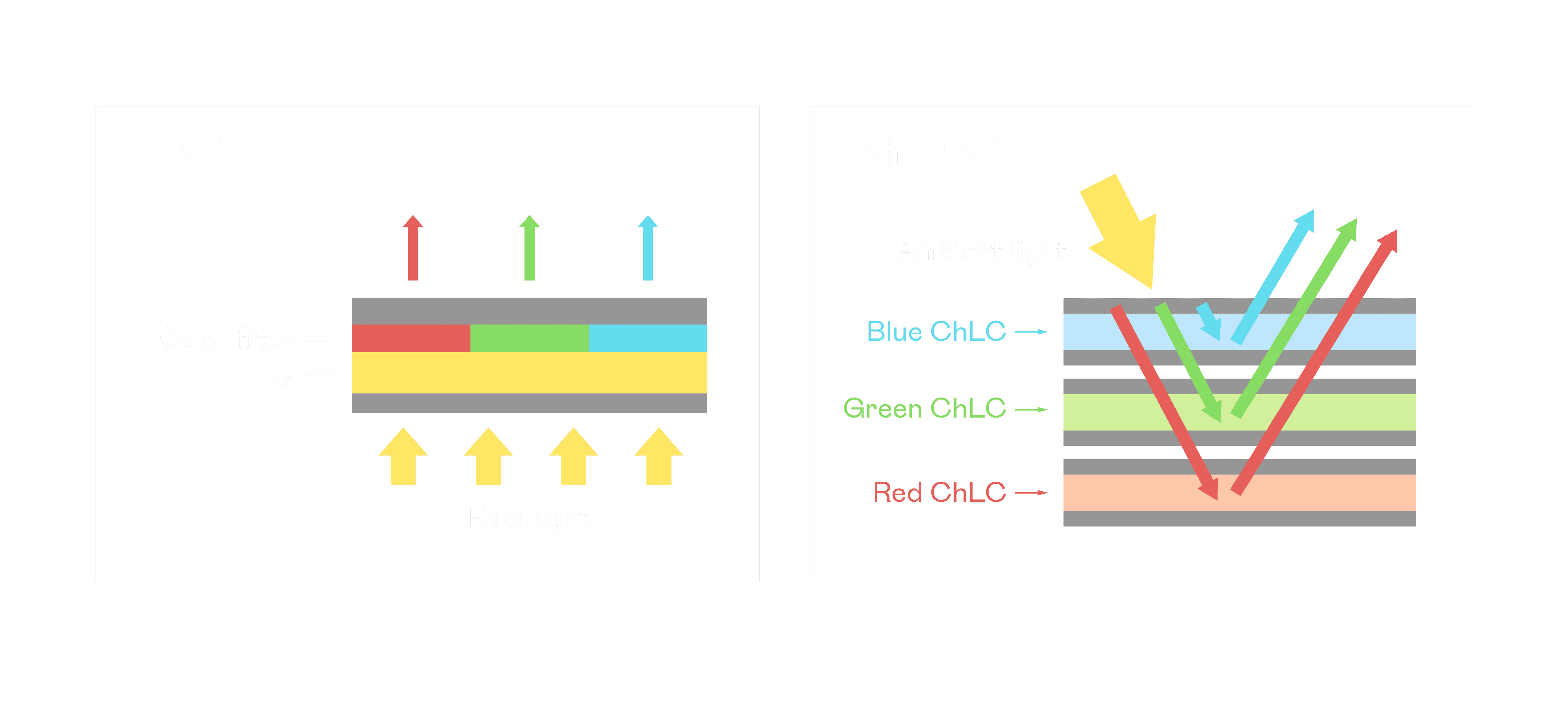 ChLCD 胆固醇液晶就如同纸张一样,,,,透过反射环境光来显示影像,,,,因此长时间观看不易造成人眼视觉疲劳,,,可达到护眼效果。。。当处于户外阳光下使用,,,,LCD 影像容易失真而不易观看,,,,但胆固醇液晶仍可维持较佳的影像品质。。